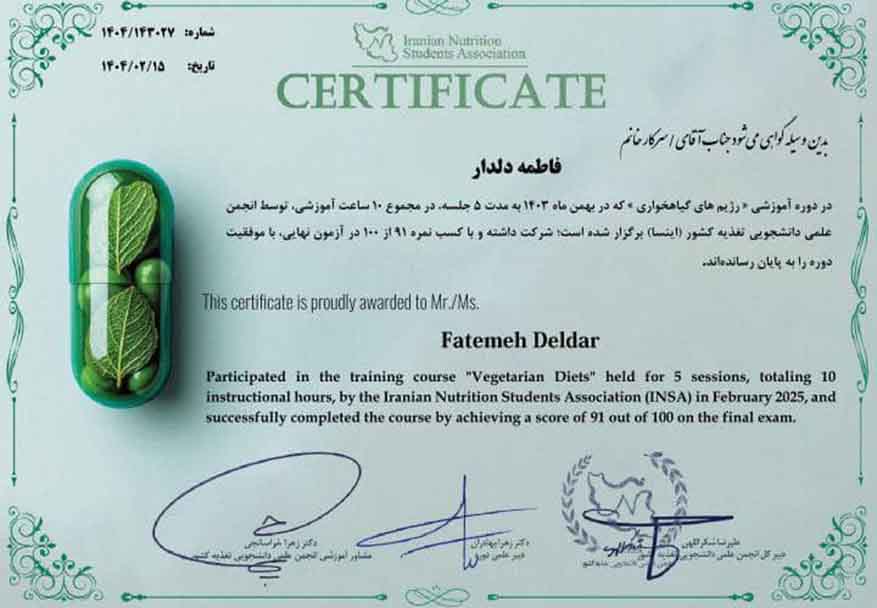 من فاطمه دلدار هستم. سال ۱۳۹۷ در رشته علوم تغذیه دانشگاه علوم پزشکی جندیشاپور اهواز پذیرفته شدم. علاقهام به این حوزه از دوران دبیرستان آغاز شد؛ جایی که بهطور اتفاقی با رشته تغذیه آشنا شدم و دریافتم بسیاری از بیماریها با انتخاب سبک زندگی سالم و تغذیه درست قابل پیشگیری و حتی درمان هستند. پس از ورود به دانشگاه، علاوه بر گذراندن دروس تخصصی، به تحقیق و مطالعه بیشتر در زمینه تغذیه سالم پرداختم و فعالیت خود را در زمینه ترجمه و تولید محتوا آغاز کردم. همچنین افتخار همکاری در ترجمه کتاب مرجع «درک تغذیه» را داشتهام.